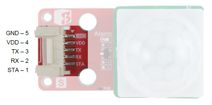 回答:可以通过两种方式判断:(1) 观察 Alarm LED:报警时 LED 会点亮(若设置为高电平报警);(2) 读取 STA 引脚电平:侦测范围内无生物时,预设输出低电平;有生物靠近并触发报警时,输出高电平。也可以通过 UART 指令读取侦测状态。